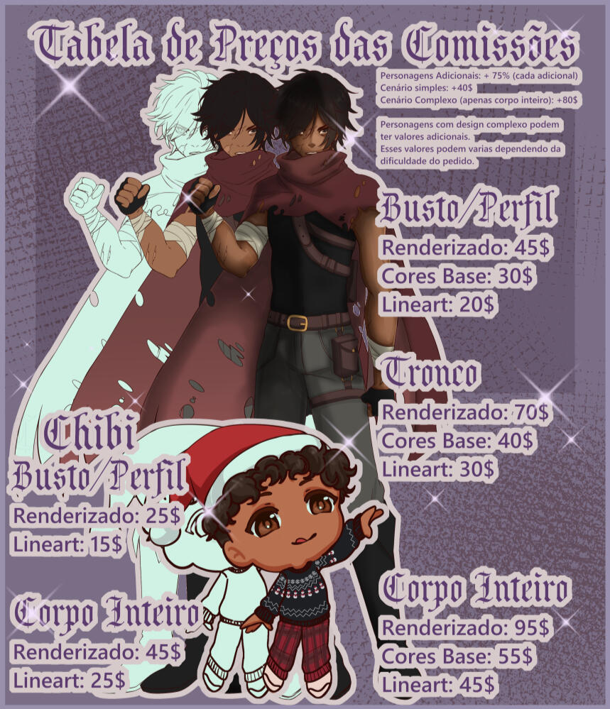 • A arte será feita com base no que foi combinado previamente. Alterações significativas após aprovação do sketch (como mudança de poses, cores, design de personagem, etc) podem gerar custos adicionais.